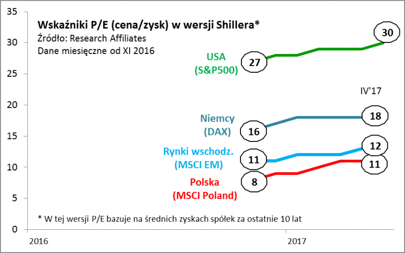 Ostatnio zaskoczył jednak wielu obserwatorów. "Powiedziałbym: nadal trzymaj część portfela w akcjach, bo mogą podrożeć o 50 proc. z obecnych poziomów. Tak właśnie stało się w okolicach 2000 roku, kiedy to po osiągnięciu obecnych poziomów (P/E) rynek poszedł w górę jeszcze o 50 proc." - stwierdził Shiller w wywiadzie dla CNBC. Słowa te wywołały sporo zamieszania, zwłaszcza że niektóre media łagodnie mówiąc posunęły się do nadinterpretacji. Jeden z tabloidów zrelacjonował słowa noblisty jako "akcje podrożeją o 50 proc.", mimo że ekonomista zastrzegł, że "dopuszczam scenariusz, w którym ceny akcji będą rosły jeszcze przez lata, ale w żaden sposób tego nie prognozuję". Dla nas ostatnia wypowiedź Shillera mimo wszystko nie jest aż tak zaskakująca, bo wcześniej noblista nie zalecał przecież sprzedawania akcji, mówił jedynie o tym, że wysokie odczyty P/E mogą zapowiadać niskie stopy zwrotu w perspektywie wielu kolejnych lat. Zresztą Shiller nadal mówi o wysokich wycenach w USA i pod tym względem nic się nie zmieniło. Warte odnotowania jest jednak to, co w tym samym wywiadzie słynny ekonomista powiedział na temat akcji na innych rynkach. "Jeśli ktoś chce dywersyfikować portfel, to wystarczy skierować się ku jakiemukolwiek innemu rynkowi i wskaźnik P/E jest niższy". I chyba to jest najważniejsze stwierdzenie.