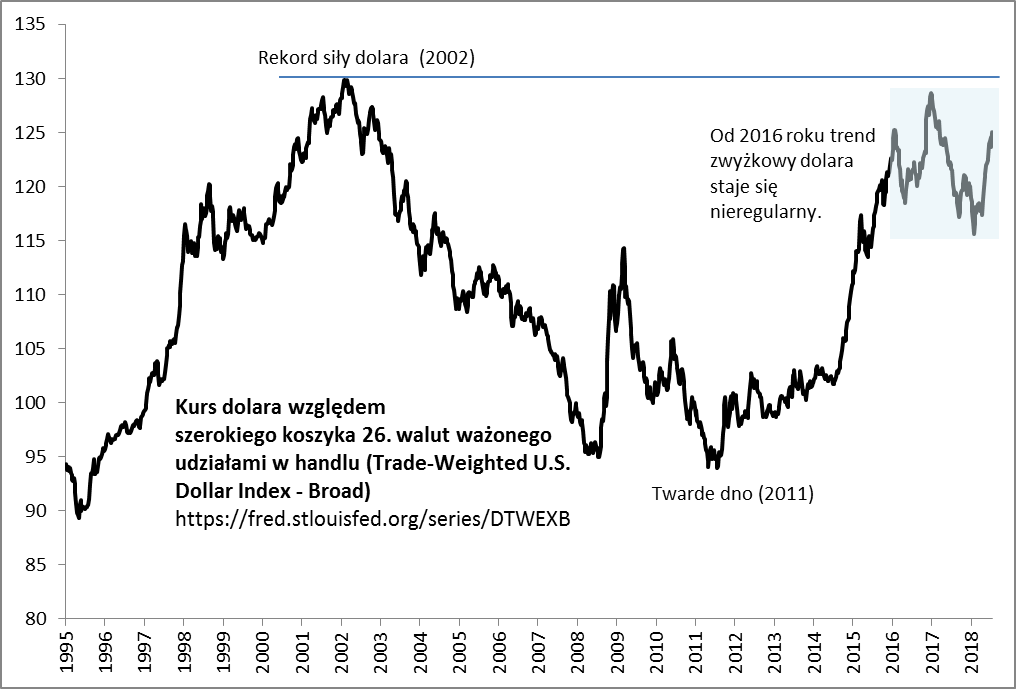 Trudniej zawyrokować, kiedy to miałoby nastąpić. Nie widać jeszcze klarownych sygnałów zmiany trendów. Widać natomiast pewne zjawiska, które w dalszym horyzoncie czasowym mogłyby zaowocować takimi sygnałami. Zwróćmy przede wszystkim uwagę na fakt, że szczyt w ramach trendu wzrostowego dolara miał miejsce jeszcze pod koniec 2016 roku (to wtedy na okładce „The Economist” pojawiło się hasło „the mighty dolar” – potężny dolar). Z kolei w ub.r. amerykańska waluta przeżyła największą od lat korektę spadkową. I choć począwszy od lutego dolar jest znów w ofensywie, to jednak widać, że w ostatnich kilkudziesięciu miesiącach tendencja zwyżkowa straciła wcześniejszy wigor.