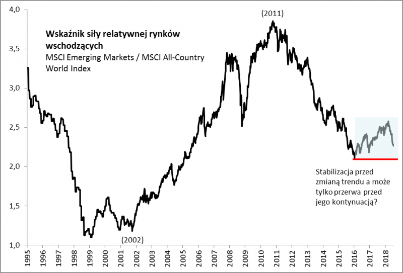 Podobnie sytuacja wygląda, jeśli chodzi o tzw. siłę relatywną rynków wschodzących. Podczas gdy od początku 2011 roku do końca 2015 niemal nieprzerwanie malała, to szczególnie w ubiegłym roku emerging markets podjęły pierwszą odważną próbę kontrataku (właśnie za sprawą korekty na dolarze). Owszem, ostatnie miesiące nie są udane, ale wskaźnik siły relatywnej rynków wschodzących jest ciągle powyżej dołka z początku 2016.