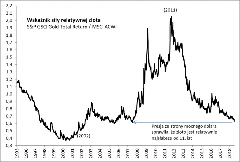 Kto wie zatem czy ta dość chaotyczna huśtawka na rynkach z ostatnich kilkudziesięciu miesięcy nie stanowi okresu przejściowego przed zmianą wielkich, wieloletnich trendów? Na wykresach ewidentnie powstają obszerne formacje. Z drugiej strony, jeśli popatrzymy na wspomniane wcześniej lata 90., to wtedy dolar przestał się umacniać dopiero po przejściu globalnej bessy.