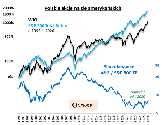 Sam fakt, że w styczniu WIG urósł mocniej niż S&P 500 (6,5% wobec 1,4%), nie jest może sam w sobie aż tak interesujący. Ale jeśli zerkniemy na szerszy kontekst, to okaże się, że właśnie dzięki tej przewadze tzw. współczynnik siły relatywnej WIG względem amerykańskiego odpowiednika (w lepszej w długoterminowych porównaniach wersji Total Return, czyli z uwzględnieniem dywidend) znalazł się na koniec stycznia najwyżej od lutego 2020.