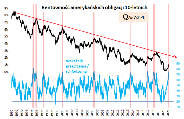 - Z wykresu wynika, że korekta wzrostowa rentowności jest "przegrzana" najmocniej od ... 1994 roku (wg tygodniowego oscylatora RSI);