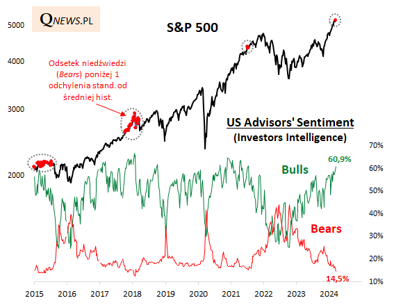 Wygląda zatem na to, że coraz mocniej odchylające się od normy odsetki optymistów i pesymistów w badaniu Investors Intelligence niekoniecznie są natychmiastowym zagrożeniem dla hossy na Wall Street - to dobra wiadomość - aczkolwiek można jednocześnie na podstawie historii wnioskować, że są one typowe już dla ostatnich miesięcy zwyżki przed nadejściem poważniejszych turbulencji.