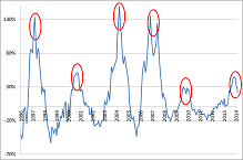 Zasadniczo rys. 2 nie odbiega od wykresu, który prezentowałem dwa tygodnie temu przy okazji analizy wskaźnika PMI. Nie licząc rozgrzanej do czerwoności hossy w I poł. 2007 r., we wszystkich pozostałych przypadkach po ustanowieniu szczytu przez roczną dynamikę sWIG80 nie można już było liczyć na pokaźne stopy zwrotu. Standardem był raczej trend boczny, z pojawiającymi się co pewien czas mało udanymi próbami sięgnięcia po nowe szczyty hossy. Po upływie ok. pół roku indeks zaczynał się coraz bardziej uginać pod presją.