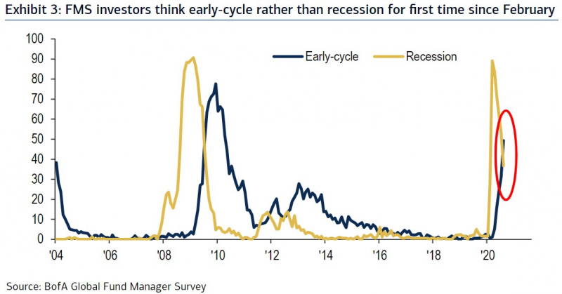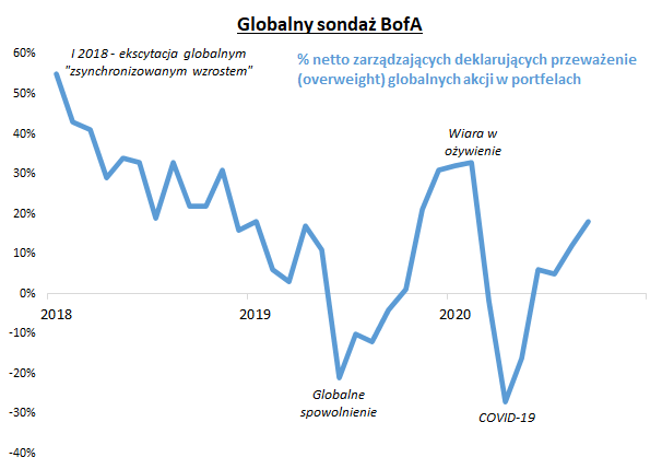 Pozytywnie z punktu widzenia rynków akcji odczytywać można choćby to, że wg rosnącego odsetka menedżerów gospodarka światowa wychodzi z recesji i jest w początkowej (Early-cycle), dynamicznej fazie ożywienia - na myśl przychodzi od razu analogia z latami 2009-10.