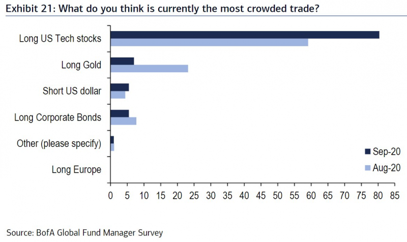 A co niepokoi? Ponad 80% (wobec niespełna 60% w sierpniu) menedżerów wskazuje amerykańskie spółki technologiczne jako zbyt popularne - jeszcze nigdy tak wysoki odsetek ankietowanych nie określał jakiegokolwiek aktywa jako "zatłoczonego". To może niepokoić, bo sektor technologiczny dużo "waży" w amerykańskich indeksach.