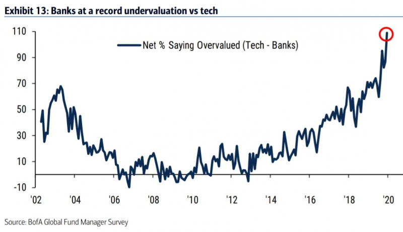 Zwykle jest tak, że kiedy jeden sektor jest przewartościowany, to któryś inny jest dla odmiany zapomniany lub wręcz znienawidzony. Ankietowani przez BofA wskazują obecnie sektor bankowy jako ten, który jest relatywnie skrajnie niedowartościowany w porównaniu z branżą technologiczną (pytanie jednak czy nie stanie się jeszcze mocniej niedowartościowany...).