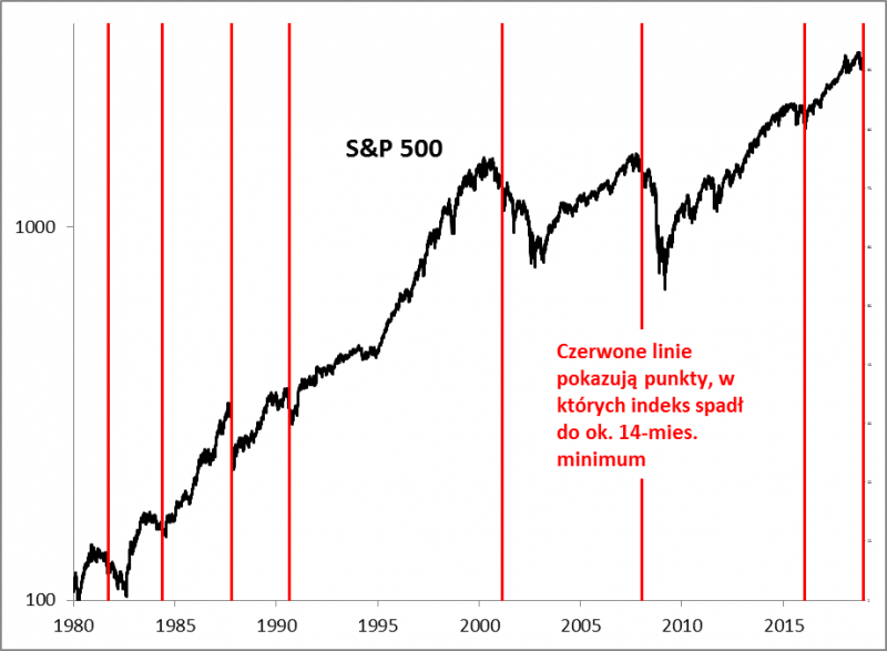 Bessy pojawiły się w trzech przypadkach w zbadanym przez nas okresie od początku lat 80. - poprzedzały je omawiane sygnały ze stycznia 2008, lutego 2001 oraz września 1981. Jednak to tylko część całego obrazu. W pozostałych czterech przypadkach spadek do 14-miesięcznego minimum pojawiał się już w końcowej fazie korekty zniżkowej (2016, 1990, 1987, 1984).