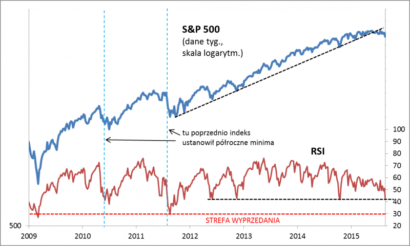Pocieszeniem jest fakt, że popularny wskaźnik RSI (wg danych tygodniowych) jest już na poziomach, przy których skończyły się trzy największe korekty spadkowe w latach 2012-2014. Wskaźnik nie jest jednak tak nisko, jak np. w sierpniu 2011 r., kiedy dotarł do tzw. strefy wyprzedania. Pesymista mógłby powiedzieć, że z uwagi na pogorszenie sytuacji technicznej (wcześniejsze przebicie linii trendu wzrostowego) oraz wysokie wyceny amerykańskich akcji należałoby spodziewać się raczej większego schłodzenia, ale przecież amerykański rynek już nie raz zdołał ku zaskoczeniu wielu wybronić się z opresji.
