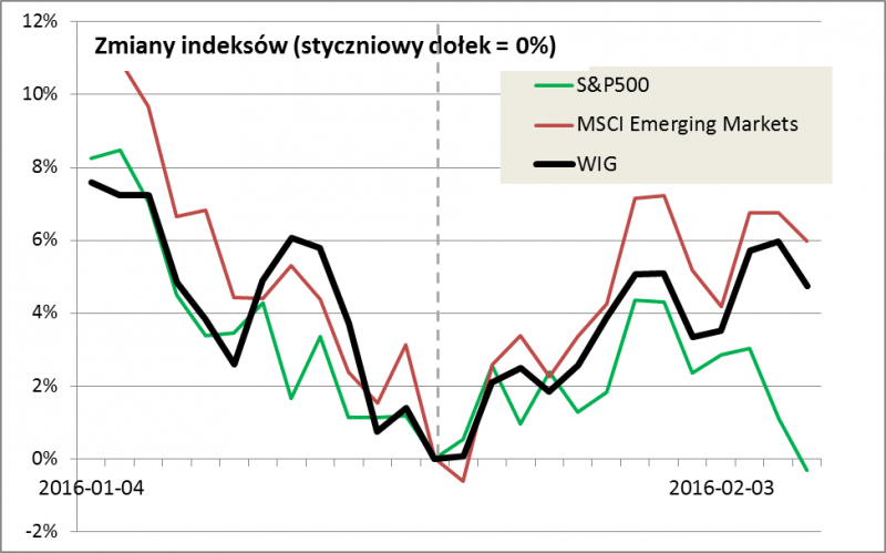 Zauważmy też, że odsuwanie się w czasie podwyżek stóp wywołało korektę w trendzie wzrostowym dolara. Dzięki temu po raz pierwszy od dłuższego czasu lepiej niż amerykański indeks sprawują się rynki wschodzące (i nasz WIG), którym mocny dolar mocno wcześniej szkodził.
