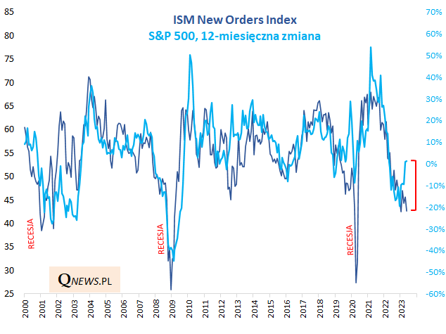 Tradycyjnie zerknijmy, jak na tle ISM New Orders wygląda giełdowy S&P 500 (ujęty w formie 12-miesięcznych zmian).