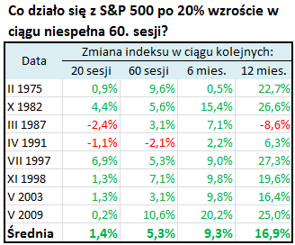 I jeszcze jedna refleksja. Okazuje się, że niemal wszystkie z wymienionych powyżej przypadków tak szybkiej zwyżki indeksu miały miejsce po głębszych spadkach (wyjątki - rok 1987 oraz 1997). Pod tym względem obecna sytuacja idealnie wpisuje się w taką normę (w grudniu S&P 500 otarł się o tradycyjny próg bessy, spadając o niemal 20%). Inna ciekawostka - tak błyskawiczna zwyżka amerykańskiego indeksu NIGDY (przynajmniej w zbadanym okresie) nie miała miejsca w trakcie bessy (takiej jak w latach 2007-2009 lub 2000-2002).