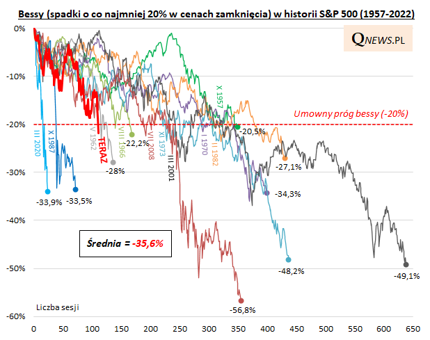 Bessa bessie nierówna - to pierwszy narzucający się wniosek po przestudiowaniu dziesięciu historycznych przypadków. Dwa najłagodniejsze z nich przyniosły przecenę ledwie przekraczającą próg bessy (z lat 1957 i 1966). Ale były też takie, które odchudziły wartość amerykańskiego indeksu o prawie połowę (2000-2002, 1973-1974) lub jeszcze więcej (2008). Gdzieś pomiędzy uplasowały się pozostałe przypadki, a wśród nich dobrze pamiętany krach w trakcie wybuchu pandemii na początku 2020 roku.