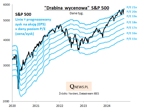 Rekordowy prognozowany zysk na akcję to także rekordy S&P 500 - to pozytywny aspekt obecnej sytuacji. Zastrzeżenia można mieć natomiast co do tego, jak rynek wycenia owe prognozowane zarobki spółek. Amerykański indeks wspiął się znów na najwyższy szczebel naszej "drabiny wycenowej", obrazujący relatywnie wysoki poziom wskaźnika P/E (ceny do prognozowanych zysków).