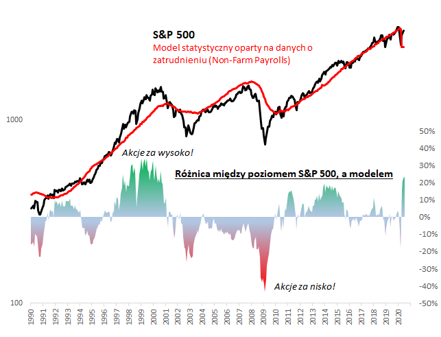 ... a to z kolei pozwala zbudować prosty matematyczny model pokazujący, gdzie "powinien" być S&P 500 w zależności od poziomu skorygowanego zatrudnienia. Okazuje się, że taki model sugeruje, że poziom giełdowego indeksu aż w 94% (!!!) historycznie można było wytłumaczyć za pomocą danych z rynku pracy.