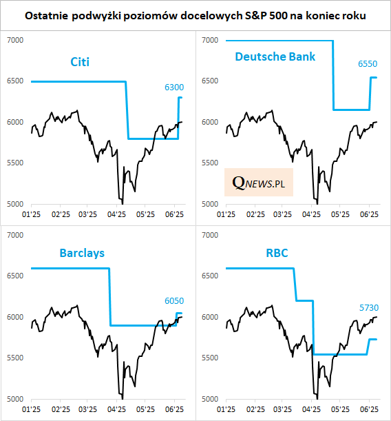 Wraz z powrotem indeksu S&P 500 powyżej 6000 pkt., do poziomu najwyższego od lutego, widać też stopniowy powrót optymizmu w prognozach strategów z Wall Street. O ile w połowie kwietnia, wkrótce po tąpnięciu na giełdach wywołanym przez cła Trumpa, pisaliśmy o "chórze" strategów tnących pospiesznie poziomy docelowe dla S&P 500 na koniec tego roku, to teraz widać tendencję odwrotną.
