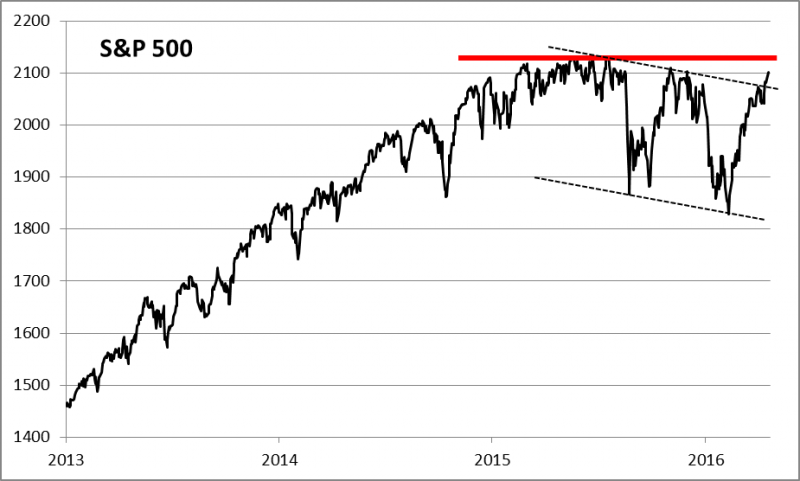 Mamy niespodziankę - amerykański S&P500 dotknął poziomu 2100 pkt. Jeszcze trzy miesiące temu ktoś, kto promowałby taki scenariusz, zostałby pewnie powszechnie wyśmiany - indeks w atmosferze strachu przed bessą szorował po niemal dwuletnich minimach, poniżej 1900 pkt. Doskonale pokazuje to, jak trudne jest prognozowanie krótkoterminowych ruchów notowań. Dlatego także teraz z przymrużeniem oka warto traktować wszelkie przewidywania. A paleta przewidywań jest szeroka - począwszy od ultraoptymistycznego scenariusza, według którego na wykresie powstało coś w rodzaju formacji "flagi" zapowiadającej kontynuację hossy, a skończywszy na takim, w którym po chwilowym i mylącym dla wielu naruszeniu historycznych rekordów (2126 pkt. w cenach zamknięcia) cała fala poprawy nastrojów ulegnie na przekór oczekiwaniom załamaniu.