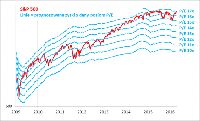 Na dłuższą metę największym problemem jest to, że powrót S&P500 w pobliże szczytów oznacza, że walory za oceanem znów są relatywnie drogie, wyceniane na prawie 17-krotność prognozowanych zysków. Dla porównania, w styczniowym dołku była to mniej więcej 15-krotność. Aby hossa była kontynuowana, konieczny byłby dalszy wzrost wskaźników P/E z tych i tak już wysokich pułapów (co trochę trudno sobie wyobrazić w obliczu zacieśniania polityki pieniężnej przez Fed - w takich warunkach historycznie wskaźniki raczej się obniżały) i/albo szybki wzrost (prognozowanych) zysków spółek. Z tymi zyskami ostatnio jest raczej tak sobie - na początku roku prognozy były ostro obcinane, ostatnio sytuacja się ustabilizowała. Szybki wzrost zarobków spółek w kolejnych kwartałach byłby z pewnością dużą niespodzianką.