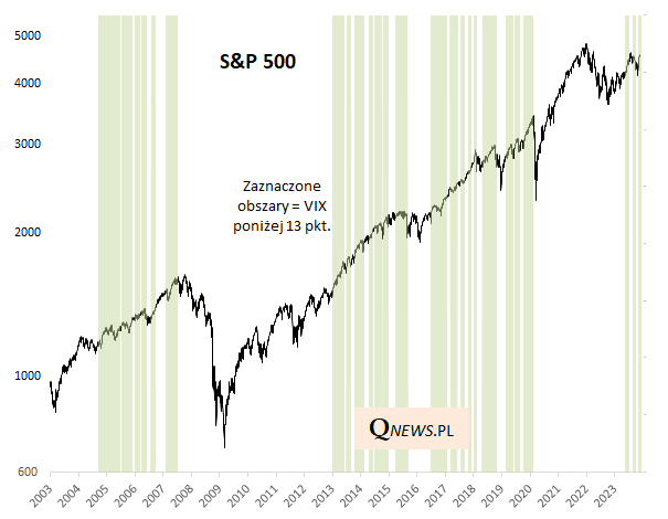 Sposobem na zorientowanie się w sposobie zachowania VIX-a jest przyjrzenie się danym historycznym. Dobra wiadomość jest taka, że niskie wartości tego wskaźnika często potrafiły występować w dłuższych seriach i związane były z relatywnie spokojną, ale systematyczną wspinaczką S&P 500. Nie ma żadnej reguły mówiącej, że po spadku VIX do poziomu takiego jak w ostatnich dniach (poniżej 13), potem musi on nagle skoczyć w górę, do poziomów silnego "strachu". Z drugiej strony, skoki zmienności, kiedy już w końcu do nich dochodzi, potrafią być gwałtowne.