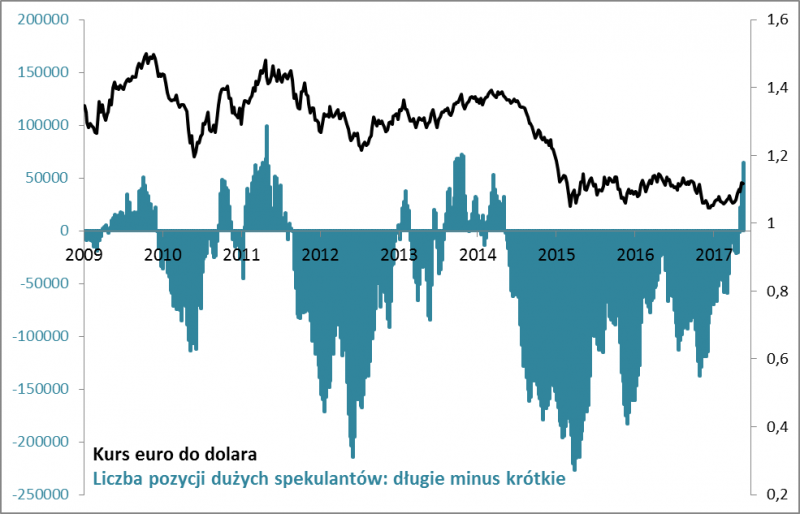 Po pierwsze traderzy rzucili się do kupowania euro (a konkretnie kontraktów na euro). Przez długie trzy lata (od wiosny 2014) europejska waluta była w niełasce - krótkie pozycje (obstawiające spadek notowań) zdecydowanie dominowały nad długimi (na wykresie pokazujemy ich różnicę). Powszechnie wierzono w to, że QE w Eurolandzie w zderzeniu z perspektywą podwyżek stóp w USA powinno popychać kurs euro w dół (tak się działo tylko w początkowym okresie). Ostatnio sporo się jednak zmieniło. Traderzy rzucili się do zamykania krótkich pozycji na fali lepszych danych makro z Europy i zmniejszenia ryzyka politycznego po wygranej E. Macrona we Francji. Doszło do sytuacji, w której długie pozycje wyraźnie dominują nad krótkimi.