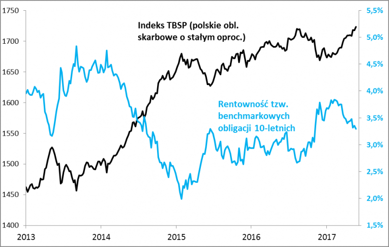 Warto zwrócić uwagę, że te wydarzenia za oceanem nie są bez znaczenia dla cen polskich obligacji, które też najpierw potaniały, by potem wbrew powszechnym opiniom podrożeć. Indeks TBSP wspiął się na rekordowe poziomy.
