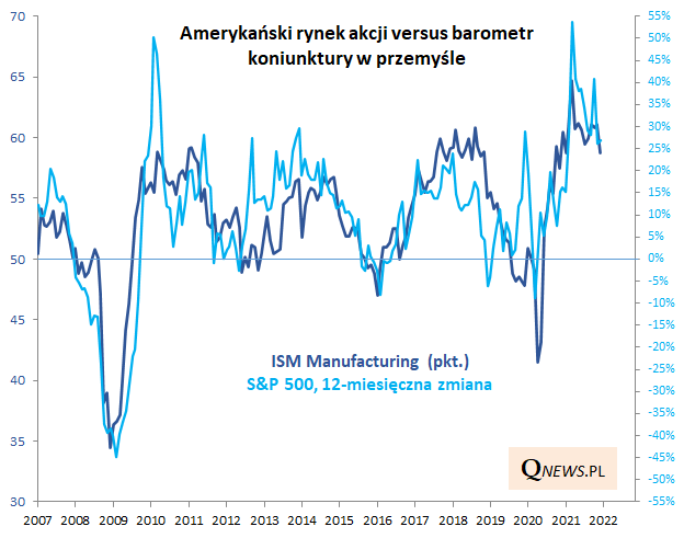 Co spadek ISM oznacza dla rynku akcji? Na razie znajduje on odzwierciedlenie nie tyle w spadku samego indeksu S&P 500, lecz raczej jego 12-miesięcznej dynamiki. Nasze symulacje pokazują, że wiele zależy od tego w jakim tempie będzie przebiegał ewentualny dalszy trend spadkowy ISM. Jeśli będzie powolny ("miękkie lądowanie" po okresie pandemicznego rajdu), wtedy może skończyć się tylko na wyhamowaniu zwyżki S&P 500. Z kolei mocniejsze spowolnienie gospodarcze ("twarde lądowanie") zapewne pociągnęłoby w dół już nie tylko 12-miesięczną dynamikę, lecz sam amerykański benchmark.