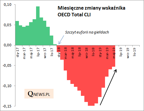 Kilka dni temu OECD podała najnowsze odczyty wskaźników wyprzedzających koniunktury gospodarczej (CLI). Globalny wskaźnik (OECD Total) po raz kolejny spadł, sygnalizując kontynuację spowolnienia na świecie (czyli osłabiania się tempa wzrostu gospodarczego).