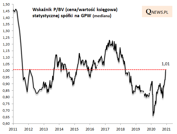 Ciekawa sytuacja jeśli chodzi o monitorowane przez nas wskaźniki ceny do wartości księgowej (C/WK, P/BV) na GPW. O ile statystyczna spółka na warszawskiej giełdzie w punkcie kulminacyjnym marcowego krachu wyceniana była z P/BV na poziomie zaledwie 0,66 (czyli 34% poniżej wartości księgowej), to obecnie wyceniana jest już z P/BV lekko powyżej 1. Wyjście powyżej poziomu wartości księgowej to dość symboliczny moment.