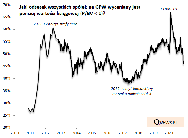 O ile powyżej pokazujemy wycenę statystycznej spółki rozumianą jako mediana (wartość środkowa, najbardziej reprezentatywna), to na sprawę można spojrzeć jeszcze inaczej. Na kolejnym wykresie pokazujemy jaki odsetek spółek na GPW notowany jest poniżej wartości księgowej (czyli z P/BV poniżej 1). W punkcie kulminacyjnym krachu było to aż 67% firm, a od tego czasu odsetek ten skurczył się do 46% i znalazł się najniżej od sierpnia 2018.