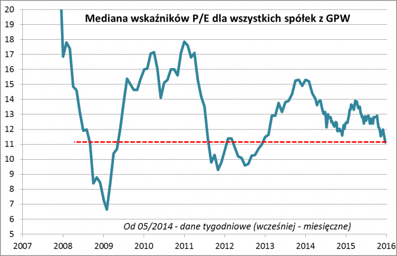 • na skutek "krwotoku" trwającego od maja ub.r. mediana P/E obniżyła się z niemal 14x do 11x;
