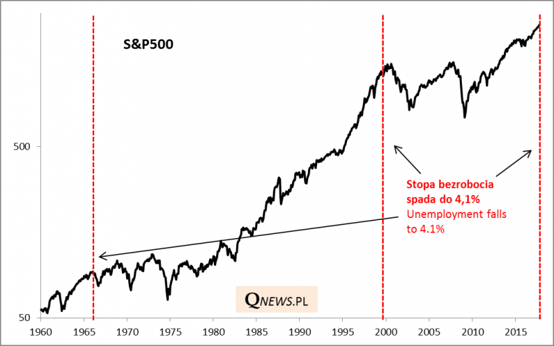 Zmiany S&P 500 przed i po spadku stopy bezrobocia do poziomu takiego jak obecnie