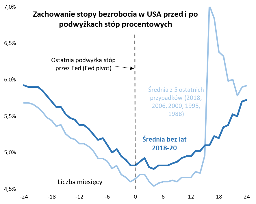 Pamiętajmy, że negatywne efekty uboczne zaostrzania polityki monetarnej pojawiają się z opóźnieniem. Widać to również na naszym wykresie. O ile jeszcze przez pierwsze mniej więcej pół roku po „Fed pivot” (końcu podwyżek) bezrobocie stabilizowało się na niskim poziomie (co ciągle dawało złudne wrażenie „miękkiego lądowania”), to potem zaczynało stopniowo rosnąć. Z każdym kolejnym miesiącem średnio rzecz biorąc ten trend przybierał na sile. Po upływie pół roku, roku i półtora roku uśredniona ścieżka bezrobocia była odpowiednio coraz wyżej względem poziomu z końca podwyżek stóp.