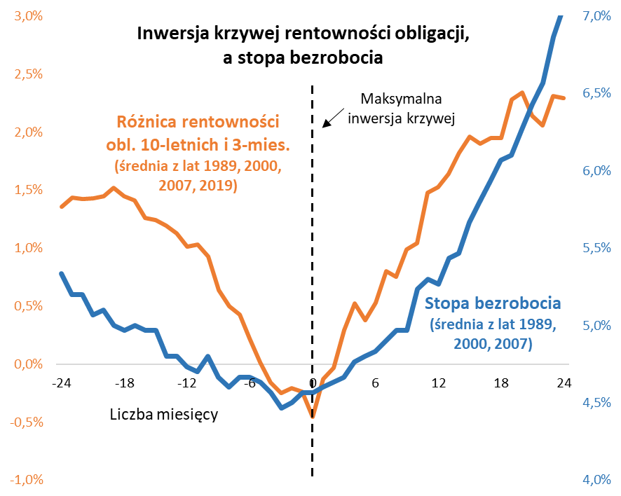 Na miękkie lądowanie można by jeszcze liczyć, gdyby nie wspomniana inwersja krzywej rentowności obligacji, niezawodny zwiastun recesji. Na kolejnym wykresie pokazujemy, że w momencie najgłębszej inwersji stopa bezrobocia była średnio rzecz biorąc jeszcze ciągle bardzo niska – również pod tym względem obecna sytuacja nie odstaje od historycznej normy. Kluczowym sygnałem było wyjście z inwersji, tzn. powrót krzywej rentowności do normalnego kształtu (wyjście spreadu rentowności na plus). Ten sygnał oznaczał początek trendu wzrostowego bezrobocia.