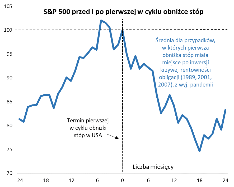 Dodatkową wskazówką, na której dokładne zbadanie przyjdzie jeszcze czas, ale o której już teraz warto wspomnieć, jest termin pierwszej obniżki stóp procentowych w USA. Na ostatnim wykresie pokazujemy, że był to ważny kamień milowy, który pojawiał się średnio niecałe pół roku po szczycie hossy, a zarazem ciągle przed kulminacyjną fazą bessy. Wraz z początkiem cięć stóp jasne stawało się, że Fed zaczyna „panikować”.