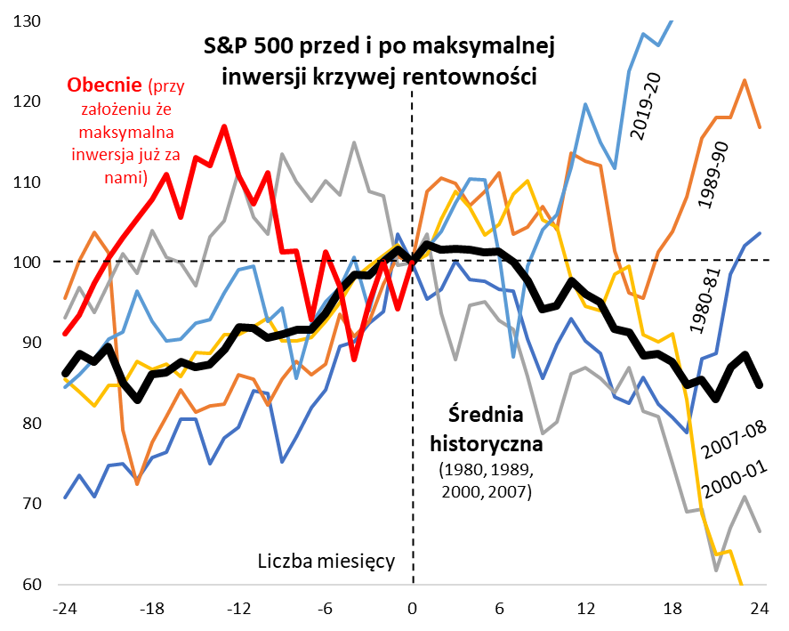 Ale może tym razem jest tak, że recesja została rekordowo wcześnie zdyskontowana, skoro akcje przeceniły się już w zeszłym roku? Oby tak było, chociaż warto zwrócić uwagę, że zdarzało się już, że ceny akcji zaczynały zniżkować przed osiągnięciem maksymalnej inwersji (rok 2000). Ponadto ubiegłoroczny spadek S&P 500 mógł oznaczać nie tyle zdyskontowanie przyszłej recesji, co raczej powrót do średniej po zbyt wybujałym 2021 roku.