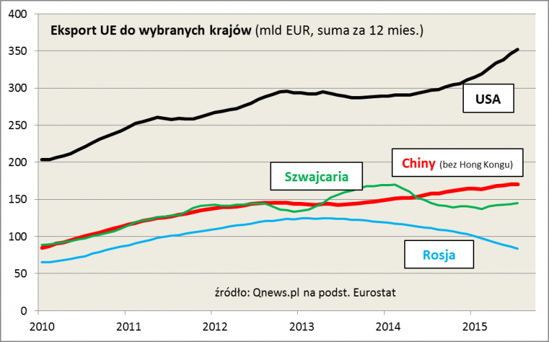 • wbrew powszechnym wyobrażeniom, Chiny nie są przysłowiowym kolosem, na którym opiera się europejski eksport - wystarczy wspomnieć, że niewiele mniejszy jest wywóz towarów do o wiele mniejszej, ale bogatszej Szwajcarii;