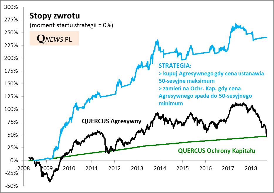 - po wzroście ceny jednostki QUERCUS Agresywnego do 50-sesyjnego maksimum (= sygnał możliwego trendu wzrostowego), zamieniamy Ochronę Kapitału właśnie na Agresywnego;