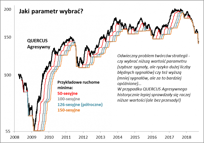 Już na pierwszy rzut oka wydaje się, że strategia tego typu może mieć sens, choć od razu stajemy w obliczu problemu związanego z wyborem optymalnego parametru. Czyli musimy zdecydować po spadku ceny jednostki do jakiego minimum (150-sesyjnego jak we wspomnianej analizie, a może "szybszego"?) należy pozbyć się danego funduszu (np. Agresywnego) i po wzroście do jakiego maksimum należy go odkupić.