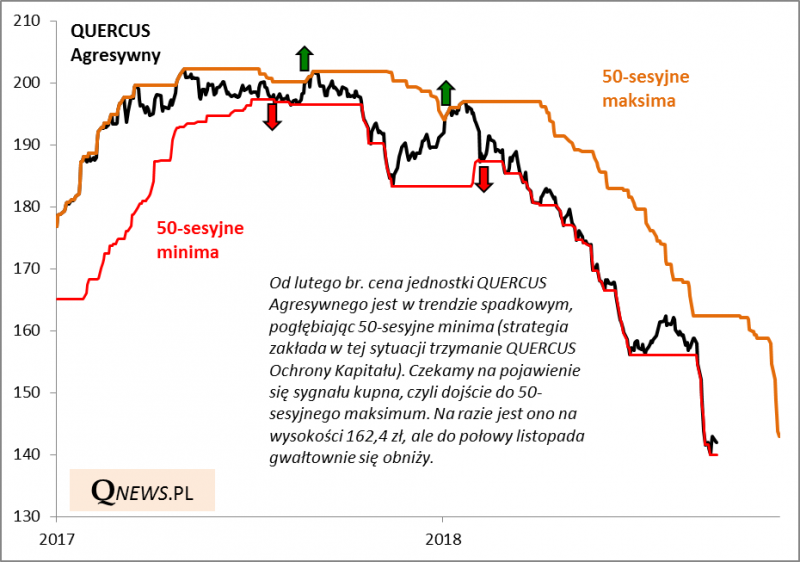 Od lutego strategia jest w trybie "ochrona kapitału". Kiedy pojawi się sygnał kupna Agresywnego? Tego nie wiadomo, ale do połowy listopada poziom 50-sesyjnego maksimum znacznie się obniży, więc znacznie łatwiej będzie o jego przebicie (uwaga - to nie oznacza oczywiście, że do listopada cena jednostki Agresywnego będzie spadać; strategia nie opiera się na przewidywaniu ruchów, lecz na reagowaniu na nie).