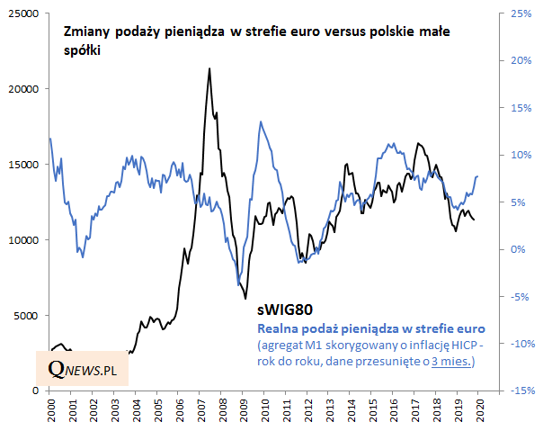 Co ciekawe z poszukiwaniem zależności między podażą pieniądza w strefie euro, a akcjami - szczególnie polskimi - eksperymentowaliśmy już kilka lat temu. Stwierdziliśmy wtedy wyraźny wpływ zwłaszcza w odniesieniu do krajowych małych spółek (sWIG80), choć późniejsze rozchwianie tej zależności w latach 2015-16 zniechęcało do kontynuowania tego tematu. Ale po odświeżeniu okazuje się, że ciągle być może jest coś na rzeczy. Teraz podaż pieniądza sugeruje, że z akcjami polskich "maluchów" powinno być coraz lepiej, choć ta zależność nie jest perfekcyjna.
