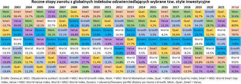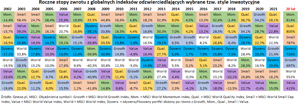 Ale nasza tabela pokazuje dużo więcej niż tylko ten tradycyjny podział w dyskusjach. Wraz z wysypem badań naukowych na ten temat na przestrzeni lat powstały kolejne kategorie inwestycyjne, które w ostatnich dwóch dekadach objętych naszym zestawieniem okazują się nawet sporo lepsze od Value i Growth pod względem odnotowanych stóp zwrotu.