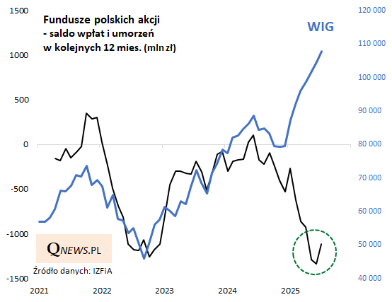 - 12-miesięczne saldo wpłat i umorzeń w funduszach polskich akcji zaczęło "zakręcać w górę" z głęboko ujemnego poziomu.