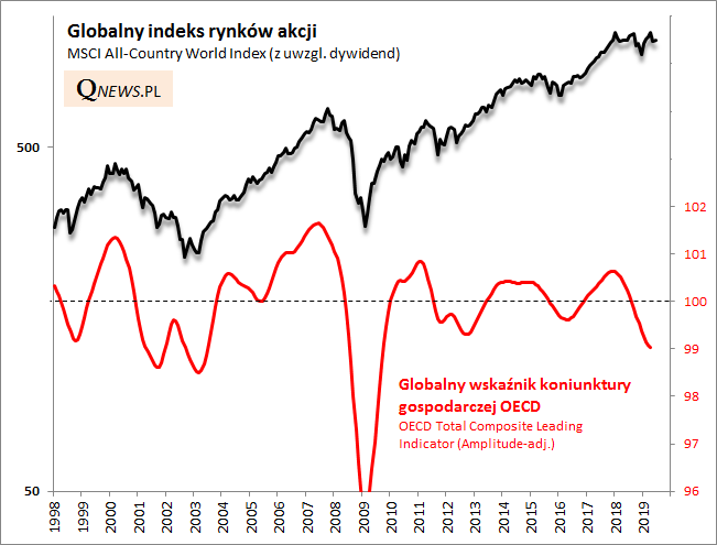Najnowszy odczyt wskaźników wyprzedzających OECD ciągle nie przynosi otuchy dla inwestorów. Flagowy wskaźnik OECD Total spadł do 99 pkt. i zawędrował najniżej od ... 2009 roku (wbrew nazwie "wyprzedzający" odczyt formalnie dotyczy kwietnia). Pocieszeniem może być natomiast fakt, że tempo spadku wyraźnie wyhamowało (w kwietniu wyniósł -0,1 pkt.).