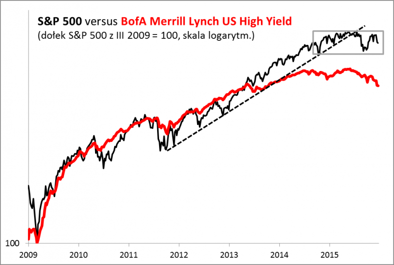 Komplikuje się także otoczenie rynkowe, czego dowodzi „dywergencja” między zachowaniem S&P500, a indeksu obligacji korporacyjnych typu high yield (o wysokim oprocentowaniu i zarazem wysokim ryzyku kredytowym). W pierwszym etapie hossy (2009-2012) obie klasy aktywów szły „łeb w łeb”, co wyrażało ogólny apetyt na ryzykowne instrumenty. W tym roku indeks obligacji high yield zaczął zmieniać kierunek trendu na spadkowy. To efekt tego, że inwestorzy żądają coraz wyższej premii za ryzyko względem bezpiecznych obligacji skarbowych. Według niektórych analityków w ślad za tym powinno pójść żądanie wyższej premii za ryzyko także na rynku akcji.