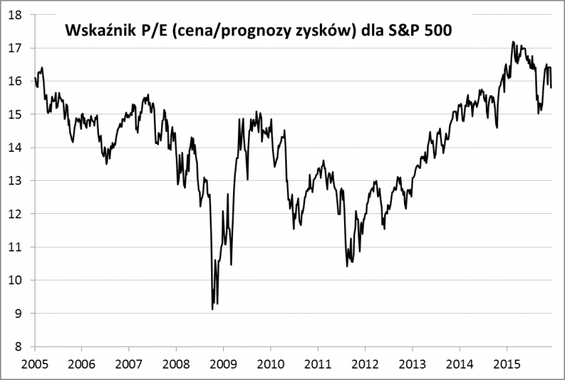 Poprawie na rynku pracy na przestrzeni ostatnich lat towarzyszył jednocześnie wzrost wycen akcji na Wall Street. Wskaźnik ceny do prognozowanych zysków (P/E) spółek urósł z kryzysowego poziomu ok. 9 do ok. 16 obecnie.