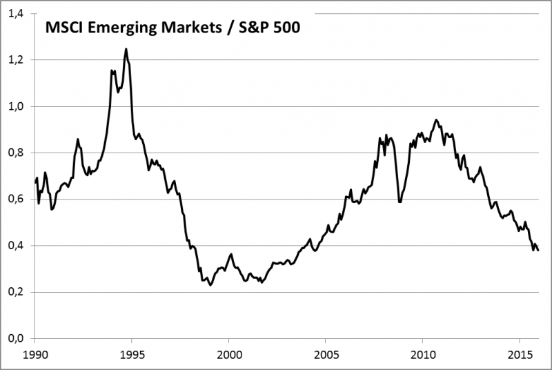 Wiadomo jedynie tyle, że „supercykl” słabości emerging markets względem USA jest mocno zaawansowany, ale dużo trudniej o odpowiedź czy czas na zmianę tego stanu rzeczy. Inwestorzy powszechnie obawiają się recesji w Chinach (z sondażu BofA/ML wynika, że jest to najczęściej wymieniany czynnik ryzyka). Nie wiadomo jednak czy oznacza to, że temat ten jest „przereklamowany” i zdyskontowany, czy jednak faktycznie spowolnienie będzie się pogłębiało. Nasz wykres (rys. 3) sugerować może, że „supercykl” zmierza w kierunku historycznego dołka z przełomu wieków, ale jeszcze go nie osiągnął…