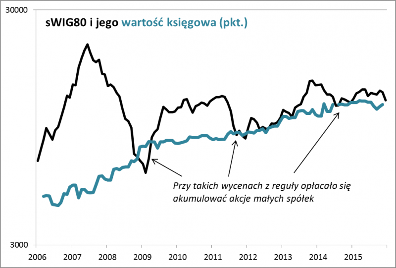 Czynników ryzyka dla tej grupy firm jest kilka. Niezależnie od tempa wzrostu gospodarczego, „misie” mogą w pewnym stopniu odczuć ewentualny ostateczny demontaż otwartych funduszy emerytalnych (rząd zapowiada „przegląd” systemu na połowę 2016 r.). Poza tym widać wyraźnie, że hossie „maluchów” nie sprzyja odpływ kapitałów na modne w tym cyklu rynki zagraniczne. Największym plusem są natomiast relatywnie niskie wyceny. Indeks małych firm ponownie zszedł w pobliże swej wartości księgowej, którą na dłuższą metę można traktować jako dolną granicę dla wycen akcji.