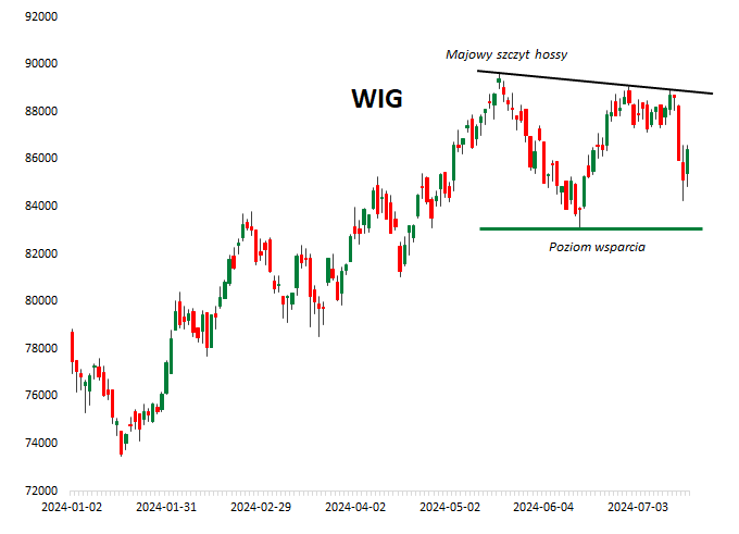 Przyglądając się ostatnim wydarzeniom na GPW, nietrudno oprzeć się wrażeniu, że sytuacja komplikuje się. WIG-owi najpierw w kluczowym momencie zabrakło sił, by zdobyć niepokonany ciągle do tej pory szczyt hossy z maja (89.414 pkt. w cenach zamknięcia i 89.658 pkt. intraday). Zgodnie z powiedzeniem, że niewykorzystane okazje lubią się mścić, ostatnie sesje przyniosły dosłownie tąpnięcie cen polskich akcji. Niemal 3-procentowy spadek WIG-u na sesji 16 lipca okazał się najgłębszy od … września 2022.
