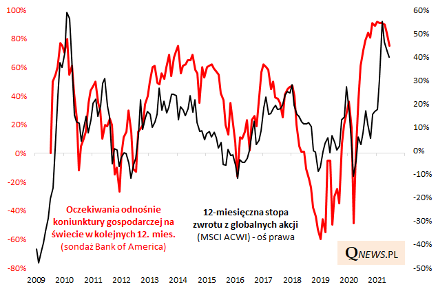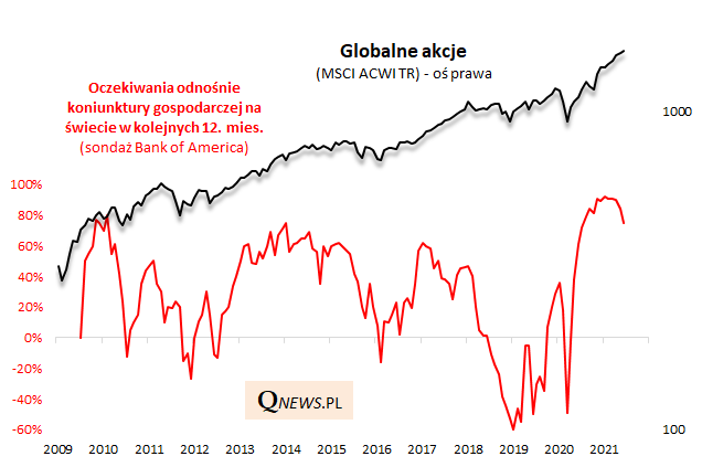Reasumując, z najnowszego sondażu BofA wynikałoby, że szczyt oczekiwań inflacyjnych i gospodarczych jest już za nami. Ewentualne dalsze obniżanie się oczekiwań odnośnie koniunktury w globalnej gospodarce mogłoby w ostatecznym rozrachunku skutkować większą korektą na giełdach, aczkolwiek dokładny timing jest tutaj problematyczny.