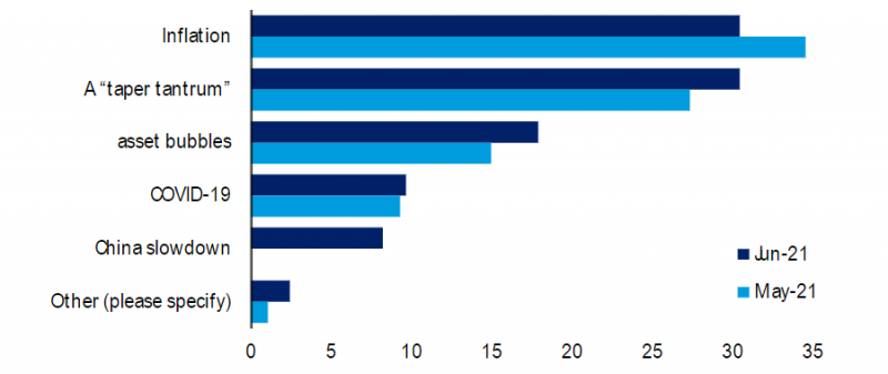 Najnowszy, czerwcowy sondaż Bank of America wśród zarządzających funduszami na świecie został zdominowany przez temat inflacji. Menedżerowie funduszy z jednej strony w większości zgadzają się z Fedem, że wysoka inflacja będzie "przejściowa" (transitory), a z drugiej właśnie inflację wskazują na ogół jako najważniejszy czynnik ryzyka.
